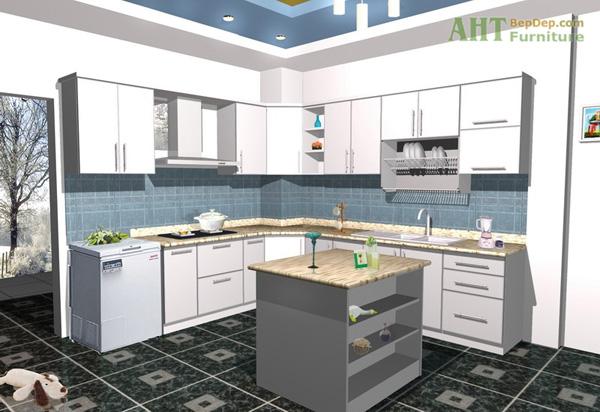 Tủ bếp gỗ Acrylic chữ I màu trắng có bàn đảo và khung tủ lạnh –TBT1866