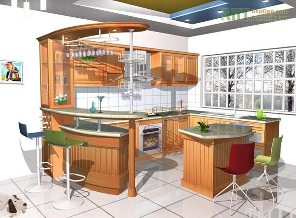 Tủ bếp gỗ Tần Bì thiết kế bán cổ điển có bàn đảo tiện dụng – TBT1976