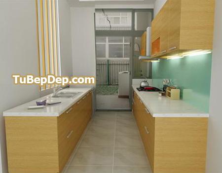 Đây là loại thiết kế tủ bếp đẹp có tính thực dụng cao vì nó tận dụng tối đa tam giác cơ bản trong bếp (là tủ lạnh – bồn rửa – bếp nấu).Tủ bếp gia đìn thiết kế kiểu hành lang tạo không gian nhiều hơn chút ít cho khu vực chế biến và tủ bếp, tuy nhiên sẽ không có chỗ cho nhiều người đứng ở giữa hai khoảng không gian chính. Tuy nhiên, đây vẫn là một thiết kế tủ bếp hiện đại và tạo thuận lợi cao.